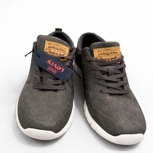 Sleek Levi's sneakers in charcoal. Comfortable fit with a stylish white sole. Ideal for casual outings. New no box.