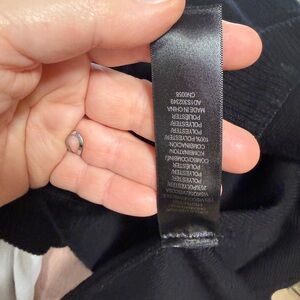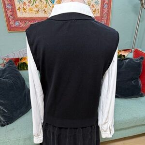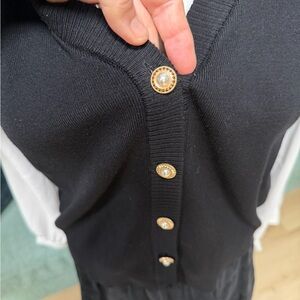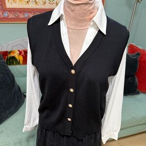 Chic black sweater vest with gold buttons. Classic white blouse underneath. Perfect for layering.