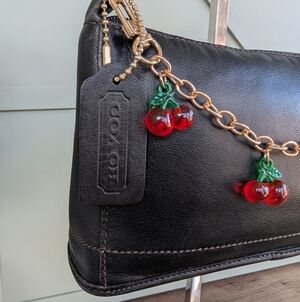 vintage Coach Bleecker Demi leather shoulder bag accessorized with a cherry-themed motif chain and matching cherry bag charm. Bag and Accessory Details Handbag: A black leather Coach Bleecker Demi bag (likely style code 9311 or 6115), a popular design from the late 1990s to early 2000s. Similar vintage models include the Hampton Demi (style 7587). Motif Chain: The bag is decorated with a gold-tone metal chain featuring multiple small resin cherry charms. These types of chains are used to add a decorative "drape" to the front of small shoulder bags.