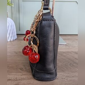 Elegant black leather handbag featuring a charming cherry detail. Perfect for adding a playful touch to any outfit.