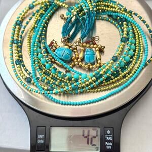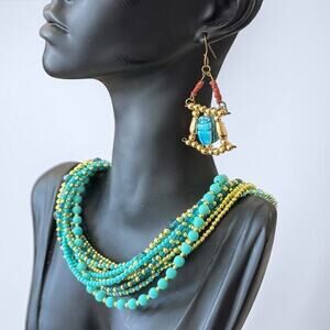 vintage necklace set, turquoise bead necklace, gold tone beaded necklace, scarab earrings, Egyptian revival jewelry, bohemian jewelry, vintage costume jewelry, statement necklace, multi strand bead necklace, turquoise gold necklace set, vintage dangle earrings, boho chic necklace, turquoise jewelry set