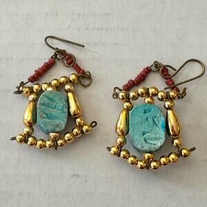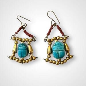 Matching dangle earrings feature a turquoise scarab-style bead framed with gold-tone beads.