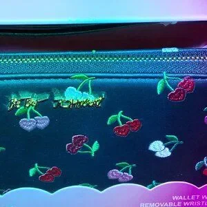The exterior features a sleek black finish decorated with beautifully embroidered cherries in red, pink, and blue tones. A gold‑tone Betsey Johnson logo and matching zipper hardware add the perfect touch of shine. The removable wristlet strap gives you the option to carry it hands‑free, making it both stylish and practical.