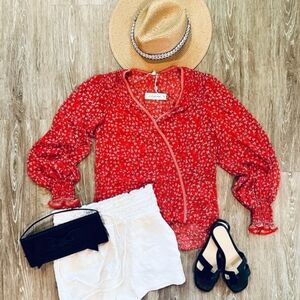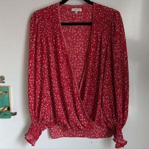 Max Studio Red White Floral Long Sleeve Wrap Style Blouse