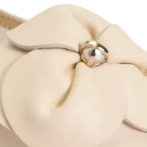 floral applique detail, faux pearl accent, cushioned footbed, grip sole, leather lined, pebbled finish