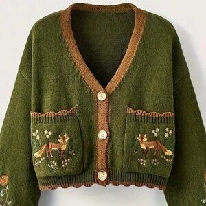 Button Up Fox Nature Army Green Cardigan With Pockets