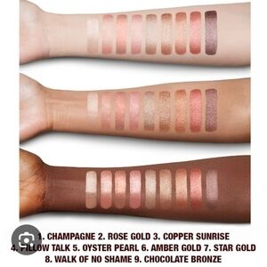 Charlotte Tilbury Star Gold Eyes to Mesmerise Long-Lasting Cream Eyeshadow is a coppery bronze with warm undertones and a metallic sheen. It had rich color coverage with a smooth, lightweight, and more mousse-like texture that was emollient without being too wet or too slippery on my skin. I didn't have issues with this shade creasing quickly on me, and I was able to apply it was a more opaque shade as well as diffused for a wash of color (which will appear best on deeper skin tones, as this one has a lower-level sheen and more base pigment). It wore well for nine hours
