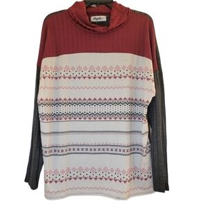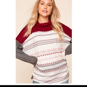 • PRODUCT: Ribbed Crimson Turtleneck Color Blocked with French Terry Ethnic/Tribal Print