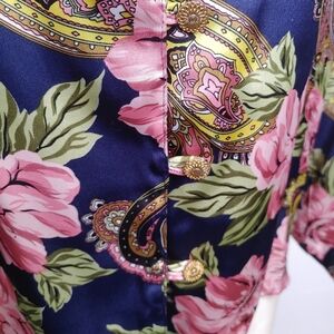 vintage satin rose paisley printed blouse with ornate gold buttons. In excellent condition. 100% polyester. Made in Taiwan.