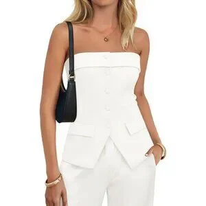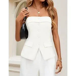 Exceptional: With a bold sleeveless and strapless design, it showcases women's charming shoulder and arm lines, exuding sexy charm. The button-up closure is convenient. Equipped with front anti-slip strips and back elastic bands to avoid slipping and ensure a stable, comfortable wearing experience. The two decorative flap pockets the overall layering and delicacy
