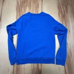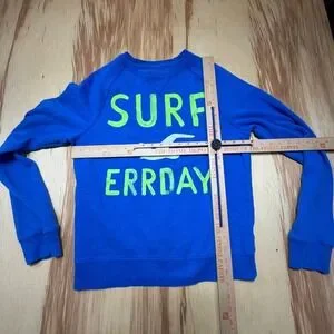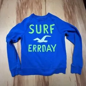 Bright blue Hollister sweatshirt with bold SURF ERRDAY neon graphic and the classic seagull logo. Men's size Large. Soft fleece-lined interior (cotton/poly blend), raglan sleeves, and ribbed cuffs/hem for a comfy everyday fit.