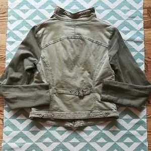 Stylish olive jacket. Asymmetrical zipper. Perfect for layering.