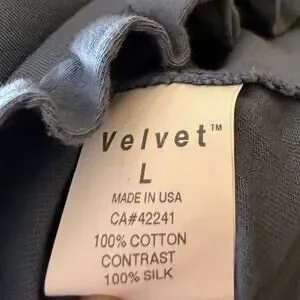 Velvet by Graham & Spencer halter midi dress in size Large, new with tags. Soft blue 100% cotton body with 100% silk contrast trim, featuring a gathered halter neckline with black strap, decorative black beaded embellishment at the chest, empire waist seam, and ruffled hem. Lightweight knit with fluid drape and effortless resort feel. Made in USA.