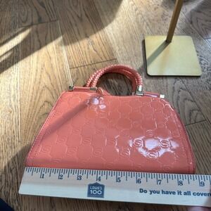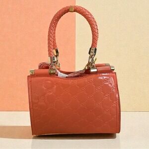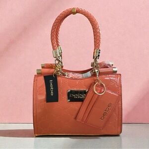 Brand new Bebe top handle crossbody in a vibrant peach patent like vegan leather. Features gold tone hardware.
