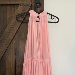 Elegant pink sleeveless jumpsuit . Perfect for any occasion. Casual or dressy! In good used condition. One small stain shown in last photo. No material tag!