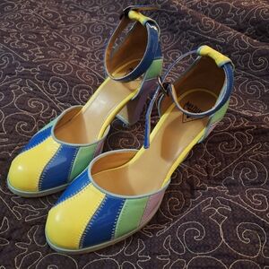 Step out in style with these vibrant ankle strap heels. Featuring a playful mix of yellow, blue, and green, these shoes are perfect for adding a pop of color to any outfit.