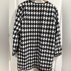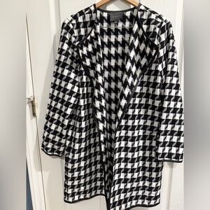 This striking trench coat from The Limited features a bold black and white houndstooth pattern, offering a timeless and sophisticated look. Its long, straight silhouette and minimalist design make it a versatile addition to any wardrobe, perfect for both casual and formal occasions.