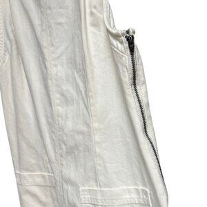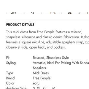 Embrace effortless charm with this Free People denim midi dress in a soft ecru ivory hue. Designed with a relaxed, shapeless silhouette, this piece offers a modern take on the classic pinafore style with its square neckline and deep open back. The adjustable straps and side zip closure ensure a comfortable fit, while the functional front and back pockets add a touch of utility to its bohemian aesthetic. This versatile garment is in new condition with tags attached. Perfect for a casual weekend brunch, a beachside stroll, or a summer garden party.