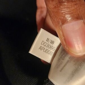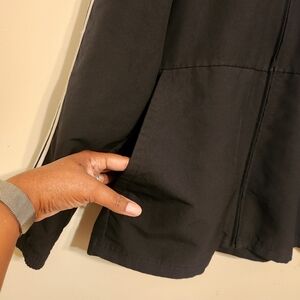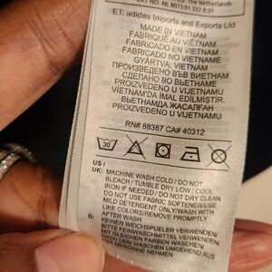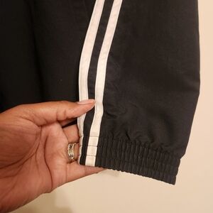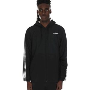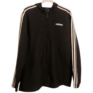 Essentials black windbreaker hooded track jacket by Adidas, size large. Full zipper closure. three stripes down sides of arms. Excellent pre-owned condition overall; drawstring ties at neck are missing.