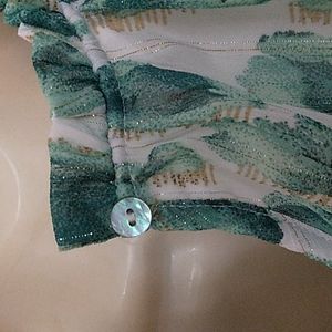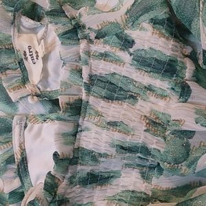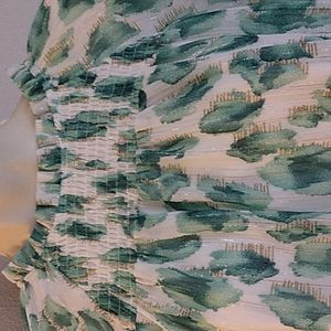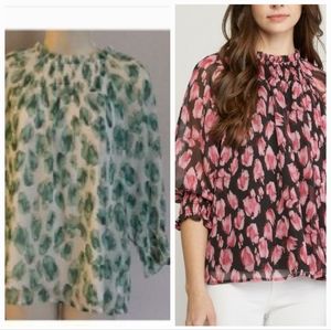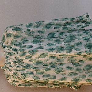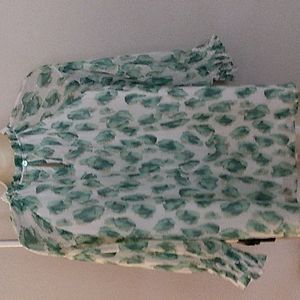 LISTING IS FOR THE GREEN TOP ONLY! (pink and black top picture is available in a separate listing) show how the top fits. Super cute top with balloon sleeves gauzy material with metallic threads add glimmer. Features adjustable ruffles at the neckline and smocking at the front and wrists back single button closure body of the top is lined, sleeves are unlined. I have this top in another color in a separate listing.