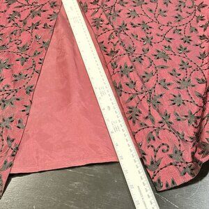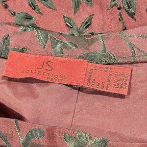 This NWT VTG Y2K women's size 14 beaded whimsigoth dark romantic maxi skirt is a statement piece perfect for formal occasions, weddings, or parties. The skirt features a stunning floral pattern with black intricate all over beadwork accents, giving it a unique and whimsical look. Made of taffeta fabric with a slit detail, this vintage piece exudes a mix of hippie, fairy, and grunge themes that are perfect for the fall, winter, or spring seasons. The skirt has a zip closure and should be dry cleaned only to maintain its quality. Made in Canada by JS Collections, this skirt is a standout addition to any wardrobe.
