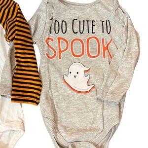 Set of two Halloween-themed bodysuits. One features 'So Franken Cute' with black and orange stripes. The other has 'Too Cute to Spook' with a ghost design.
