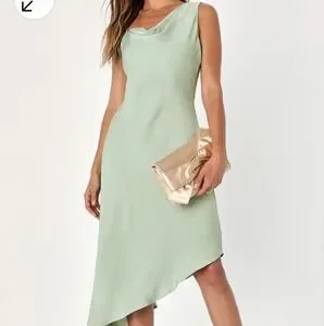 This elegant one-shoulder dress features a sophisticated drape in sage green. Perfect for any occasion, its sleek design offers a timeless look.