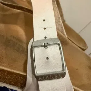 Classic Gizah Birkenstock sandals in white. Features a comfortable tan cork footbed. Ideal for everyday wear. Note discoloration in from make-up in photos.