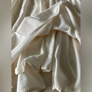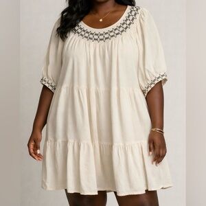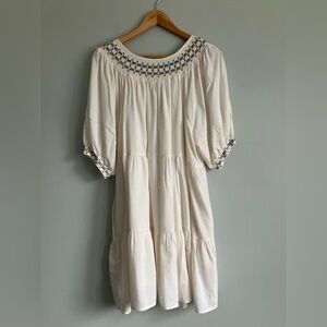 Soft ivory boho dress with a flowy tiered silhouette, delicate black embroidered neckline and sleeve trim, airy lightweight fabric, relaxed fit, and an effortless cottagecore/neutral aesthetic. It is fully lined and would look cute topped with a cardigan or a denim jacket. You could also style this a little bit more western by adding a brown belt and writing or cowboy boots.