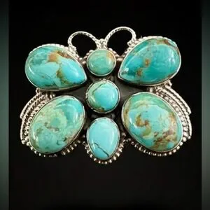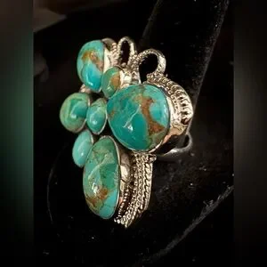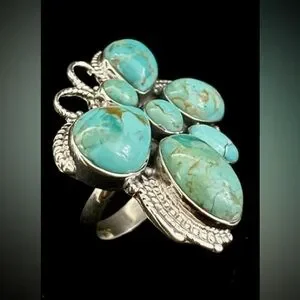 Elegant butterfly ring featuring vibrant genuine turquoise stones set in Sterling silver. Perfect for adding a touch of nature-inspired beauty to any outfit. You will get many compliments on this beautiful statement ring adjustable size currently sits at an 8