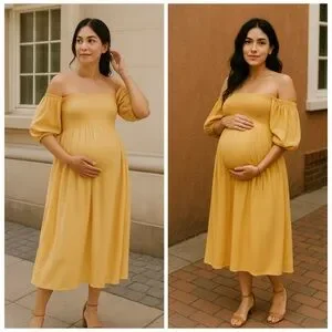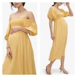 NEW with tags HATCH Yellow Puff Sleeve Off the Shoulder Maternity Smocked Midi Dress