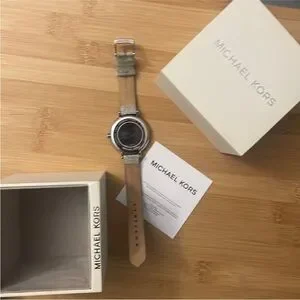 Elegant Michael Kors watch with a silver face and strap. Perfect for any occasion.