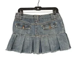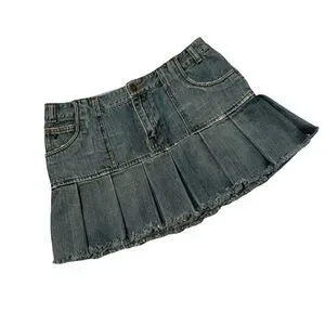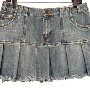 Y2k American Eagle Distressed Micro Denim Pleated Mini Skirt Fringe Hem, Sz 6