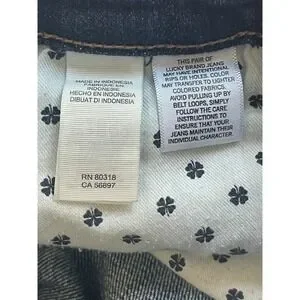 Lucky Brand denim shorts in a dark wash, featuring 'The Roll Up' style. These classic five-pocket shorts are crafted from a comfortable cotton blend with a hint of stretch for the perfect fit. Detailed with signature clover embroidery on the coin pocket and back pockets, they offer a timeless casual look. The hardware is branded Lucky Brand, and the interior pockets feature a charming clover print.