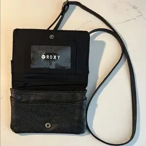 This compact Roxy crossbody bag in black is crafted from a leather-like material, featuring a practical flap closure and an adjustable shoulder strap. Its sleek and casual design makes it an ideal choice for carrying essentials with ease.