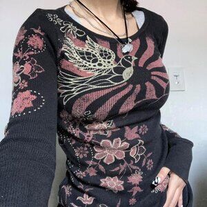 Features: This long sleeve graphic top has that cool grunge and fairy vibe, with a retro floral print and gothic gothic prints that really stand out. Made from soft polyester, it’s breathable, comfortable, and skin-friendly — perfect for all-day wear. The faux two-piece design adds a fun, layered look without the bulk. Nice loose fit, but check the size chart if you prefer it more fitted.