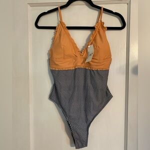 Beachsissi Peach Ruffled Black & White Stripes One-Piece Swimsuit M