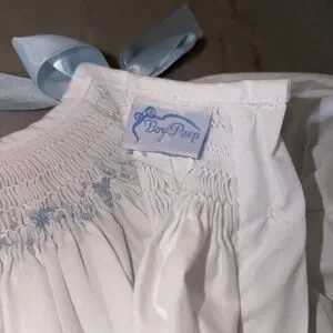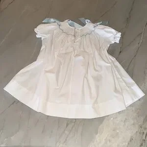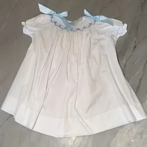 White smocked dress with and blue shoulder bows, 12 months