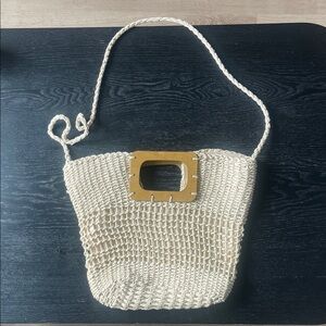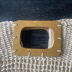 Stylish beige woven tote bag featuring a unique wooden accent. Perfect for casual outings and beach days.