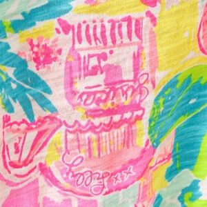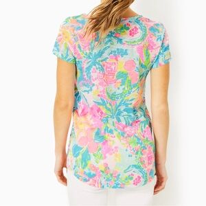 The Lilly Pulitzer Etta V-Neck Top in "Sunshine State Of Mind" is a colorful floral patterned top with a relaxed fit. Made from 100% cotton, this short sleeve top features a V-neckline and a pullover closure, making it perfect for casual occasions during the warmer seasons of summer and spring. The lightweight and collarless design adds to the comfortable and classic style of this t-shirt from the Lilly Pulitzer brand. Machine washable for easy care, this top is a stylish addition to any woman's wardrobe.