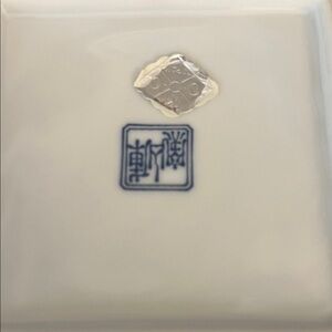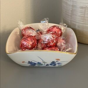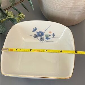 Elegant square bowl with delicate floral design. Features blue flowers and gold trim. Perfect for adding a touch of sophistication. Mint Condition with gold rim.Pretty in any room!