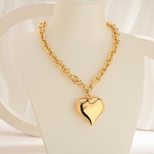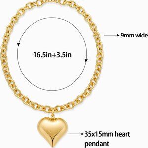 Features: A chunky, gold-plated copper chain measuring 9mm wide, with a large, puffy heart pendant that measures 35*15mm. The chunky chain and oversized heart create a bold, eye-catching look perfect for elevating any outfit.