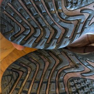 Worn for max 11 miles total of two times. Does have grass stains on the toes since they are hiking shoes. Waterproof and insoles not worn (still has the Merrel logo). Perfect bottoms with no wear (just a little dirty from use outside). Fits kind of small for a seven. I am in between 6.5 and 7 and 7 worked best.