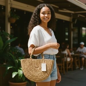 Features: Beaded design throughout, lightweight yet structured, lined interior, boho resort/beach aesthetic