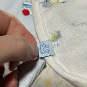 Adorable 1990s baby romper in soft pale blue with matching bib — both featuring fuzzy bear appliqués and tiny embroidered sailboats. 100% cotton, gentle ribbed texture. Bib is reversible with pastel storybook print on the back. Made by McBaby, part of The McDonald’s Corp. line.