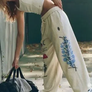 Features: Soft fabrication; smocked elastic waistband with adjustable drawstring, pockets for hands; FP Movement graphic detailing; cinched bottom hems