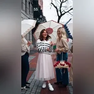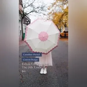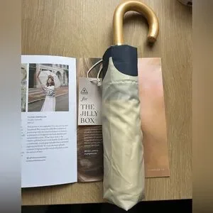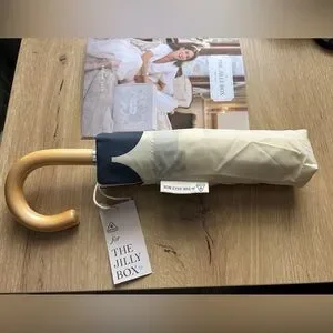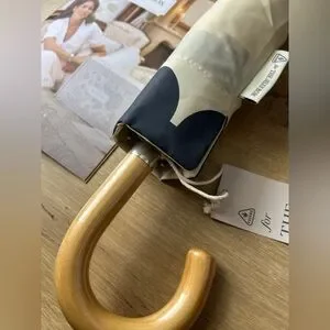 Stylish umbrella featuring a beige and navy design. Comes with a classic wooden handle.