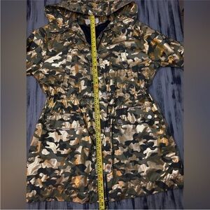 This lightweight outerwear piece features a distinct gold metallic foil camouflage print.