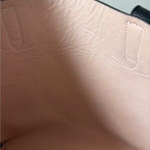This is a beautiful work bag, transition from work to night out. Black exterior pebble leather with pink interior leather. Slouchy style although it will sit upright on its own. Fits a ton of stuff. It has two shoulder straps which fit nicely on the shoulder and two tie straps on the inside to hold your items in place.