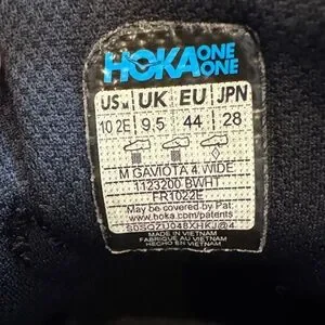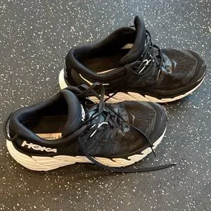 Sleek Hoka shoes in black and white. Ideal for running and everyday wear. Mostly used inside home gym, still plenty of tread. Did compete in one half marathon, 0/5 stars do not recommend d half marathons. Missing one heal hoop as shown in picture. They were in rotation with other shoes and do not smell. Overall good shape except that missing heal hoop.